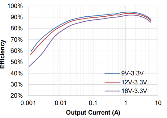 TMI3256B采用DFN2x2-6封装方式,是同规格产品中封装最小的一款,其工作电压范围4.5V~18V,可提供输出6A大电流的能力,同时具有很高的转换效率,实测VOUT=3.3V, L=3.3μH条件下, TMI3256B效率最高可达93%以上。